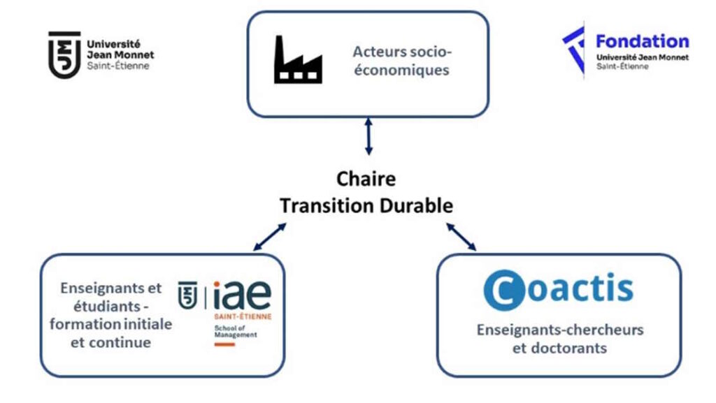 Portée par l’IAE de Saint-Etienne, le laboratoire COACTIS et la Fondation de l’Université Jean Monnet, la Chaire Transition Durable estun dispositif partenarial à la croisée du monde socio-économique et du monde universitaire (enseignement et recherche).